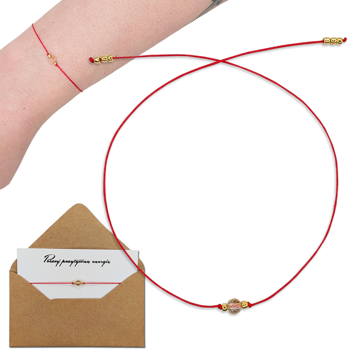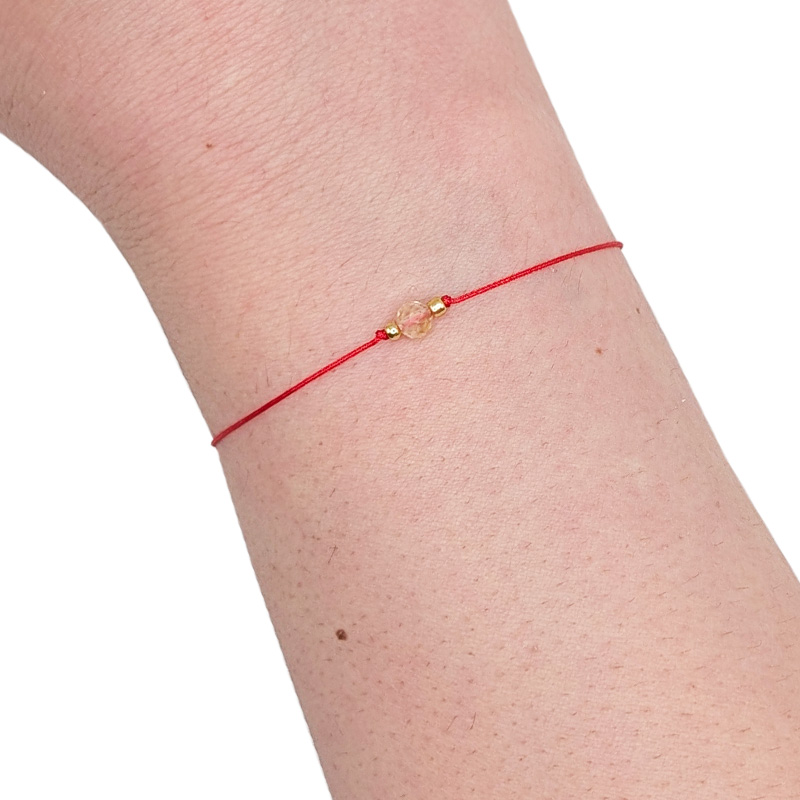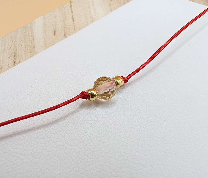 Bransoletka została wykonana na cienkim, ale wytrzymałym czerwonym sznurku nylonowym (0,5 mm), dzięki czemu: