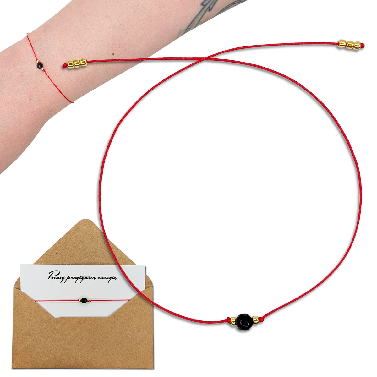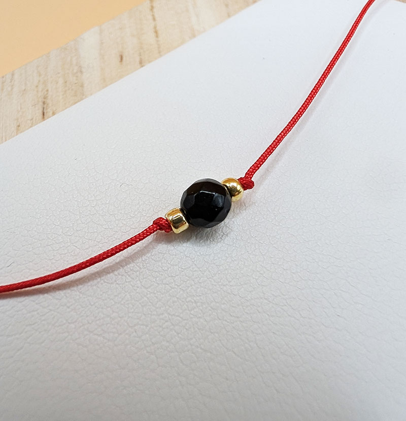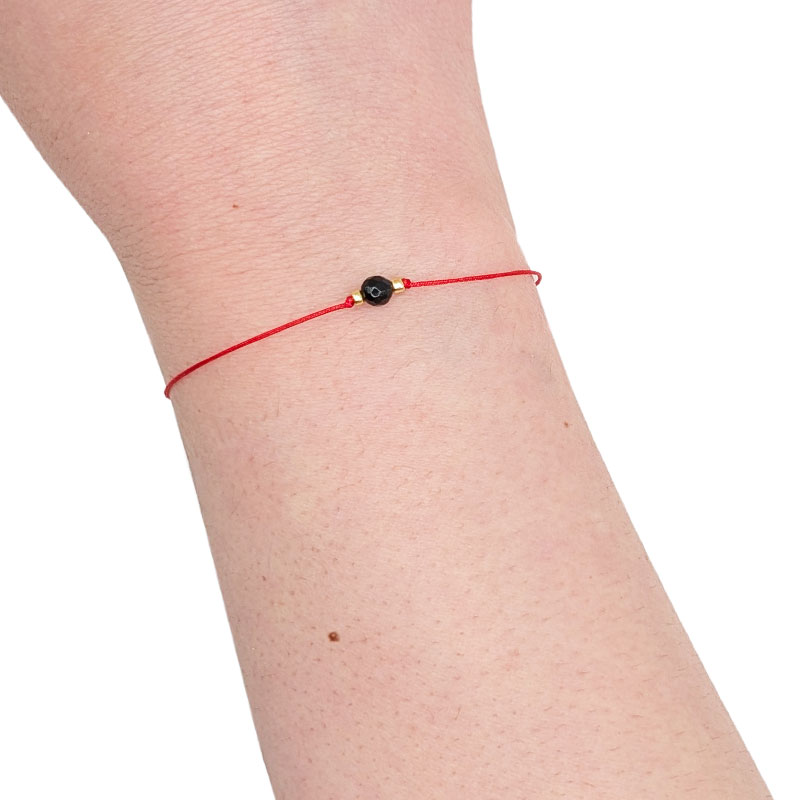 Czerwony sznurek (0,5 mm) jest lekki, trwały i niemal niewyczuwalny na nadgarstku.