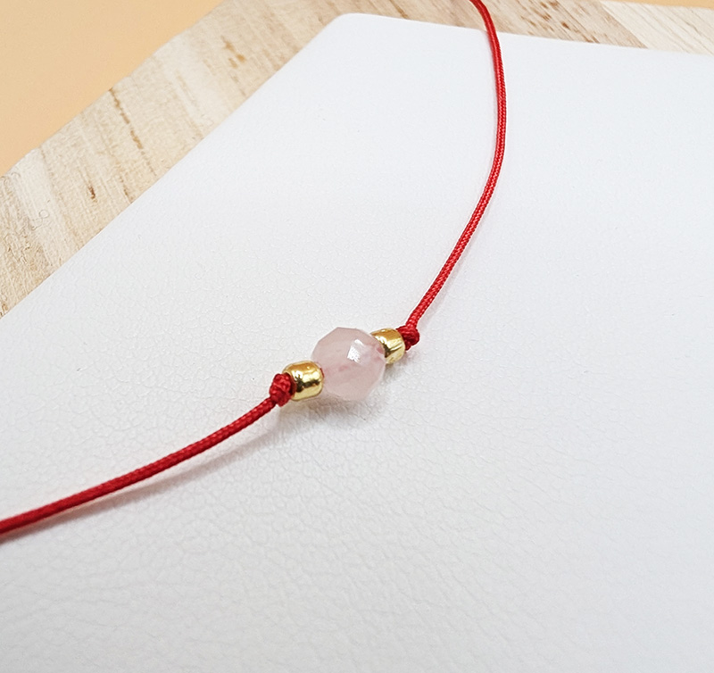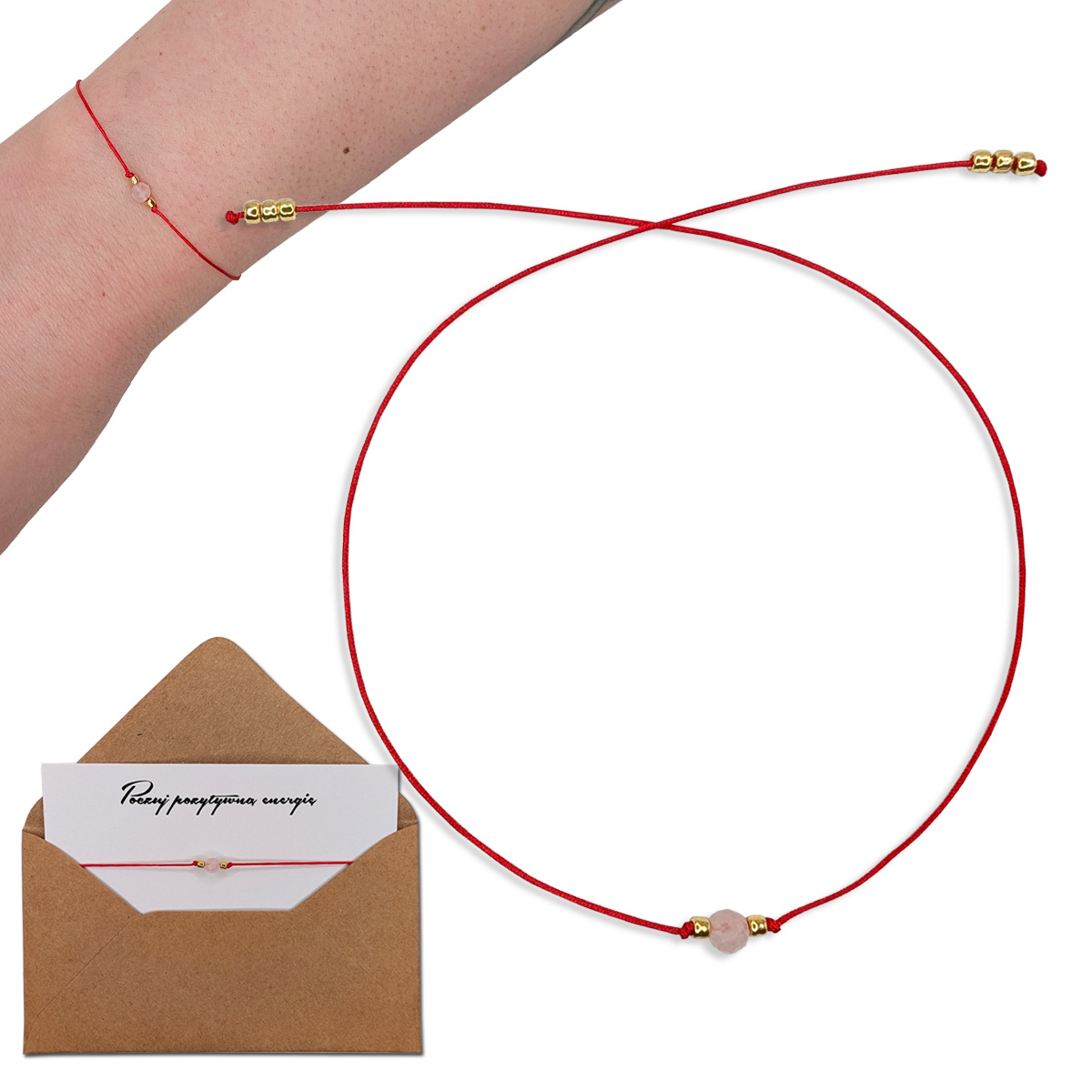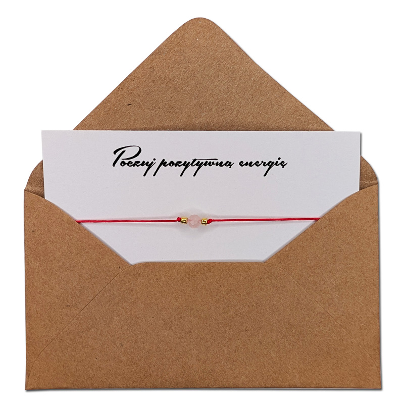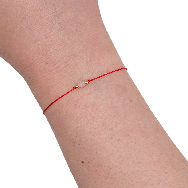 Ta delikatna, ale pełna znaczenia bransoletka powstaje dokładnie w momencie, gdy ją zawiążesz. Czerwony, subtelny sznurek oplata nadgarstek niczym ochronna nić, a w jego centrum znajduje się naturalny kwarc różowy - kamień miłości, czułości i emocjonalnej harmonii.