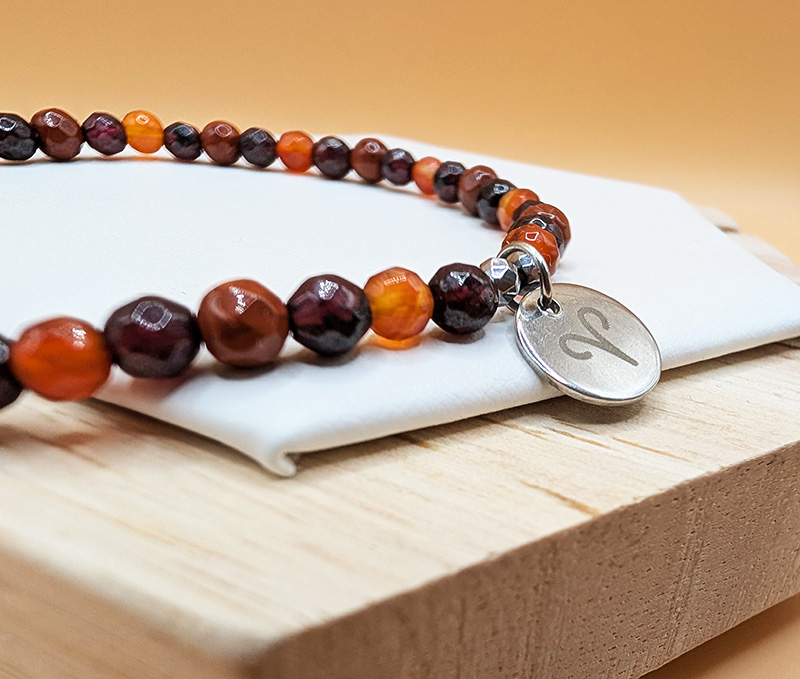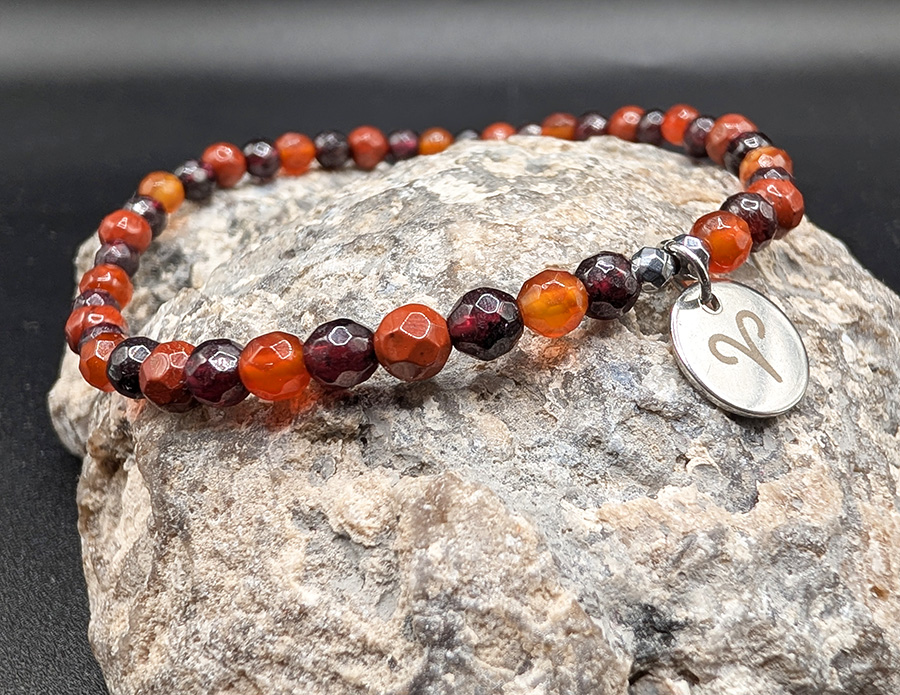Ciepłe odcienie czerwieni, bordo i ognistego pomarańczu tworzą harmonijną kompozycję, która przyciąga wzrok i podkreśla charakter biżuterii. Całość dopełnia elegancka zawieszka z wygrawerowanym symbolem znaku zodiaku Baran, która subtelnie przypomina o astrologicznej energii właściciela.