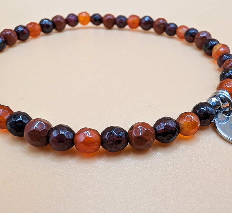 Bransoletka powstała z naturalnych, fasetowanych kamieni o średnicy około 4 mm. Każdy z nich został dobrany nieprzypadkowo - zarówno ze względu na piękną kolorystykę, jak i symboliczne znaczenie w świecie kamieni naturalnych.