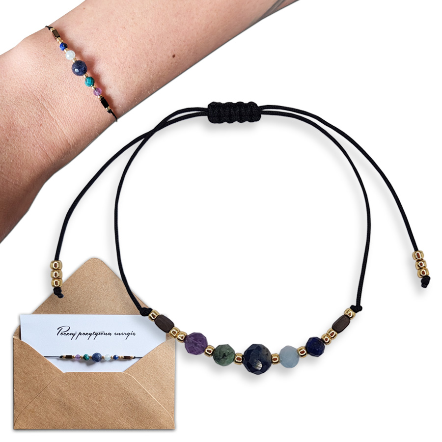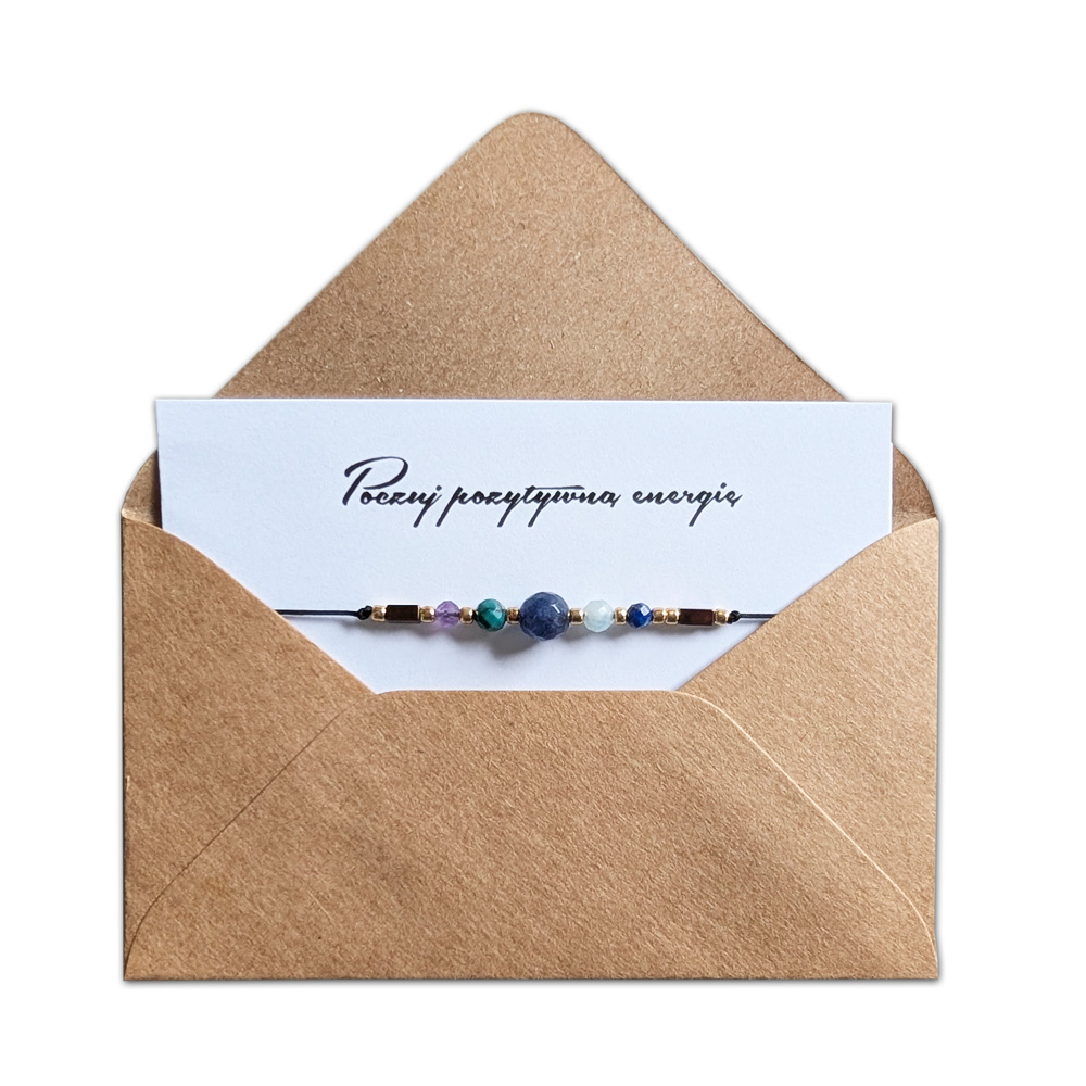 Ten cudowny drobiazg wykonany jest z czarnej nylonowej nici o grubości 0,5 mm. Po środku umieściliśmy 5 wyjątkowych kamieni - sodalit (6mm), akwamaryn (4mm), lapis lazuli (4mm), turkus (4mm) oraz ametyst (4mm). Na końcach brązowy hematyt. Sznurek zakończony jest koralikami TOHO. Średnica bransoletki przy maksymalnym rozwarciu to ok 25cm. Regulacja długości za pomocą wygodnej makramy.