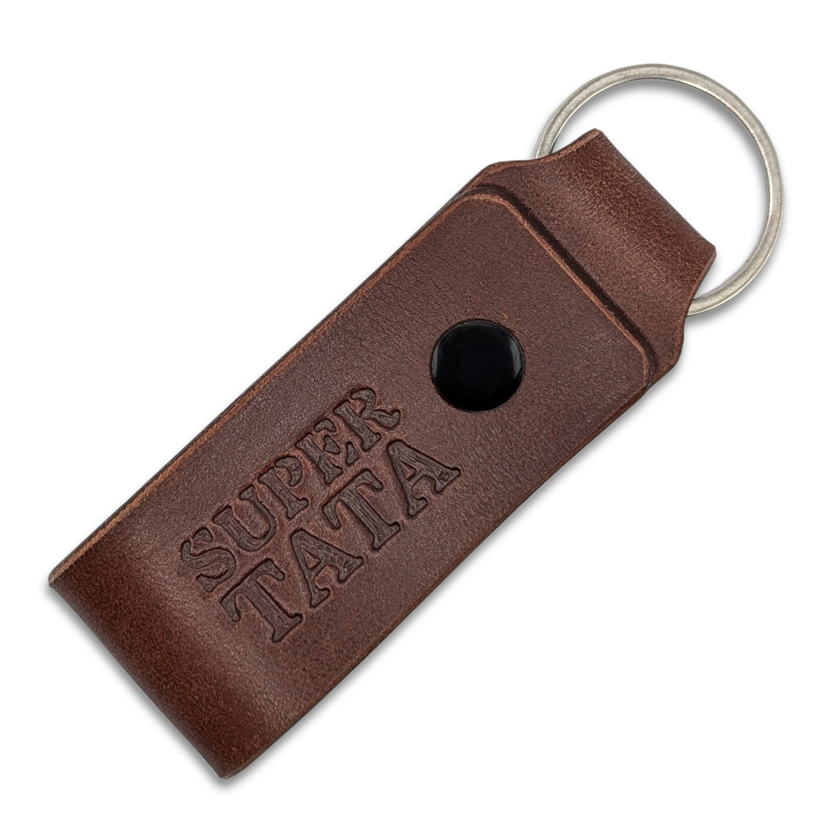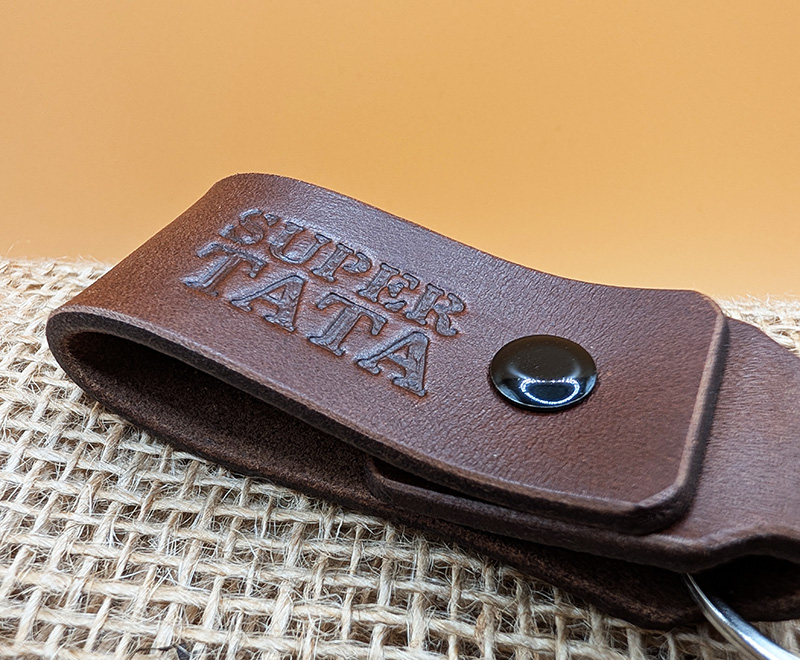 „SUPER TATA” - wytłoczone głęboko w naturalnej, garbowanej roślinnie skórze - nie blaknie, nie ściera się, nie znika z czasem.