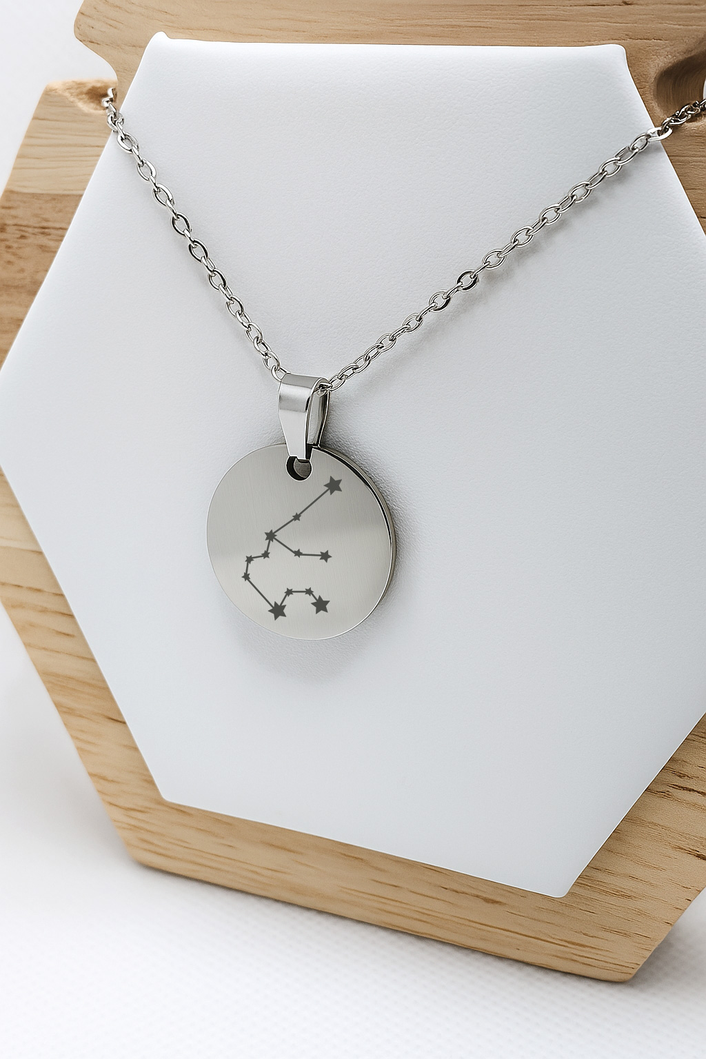 Okrągła zawieszka ze stali szlachetnej zdobi starannie wykonana konstelacja Wodnika. Symbol niezależności, innowacyjności i nieposkromionej potrzeby wolności. Polerowana powierzchnia błyszczy jak zimowe niebo tuż przed świtem - chłodno, czysto, absolutnie wyjątkowo.